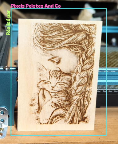 Acheter cet article via PayPalGravure photo sur bois A5 Fille au chat 20€