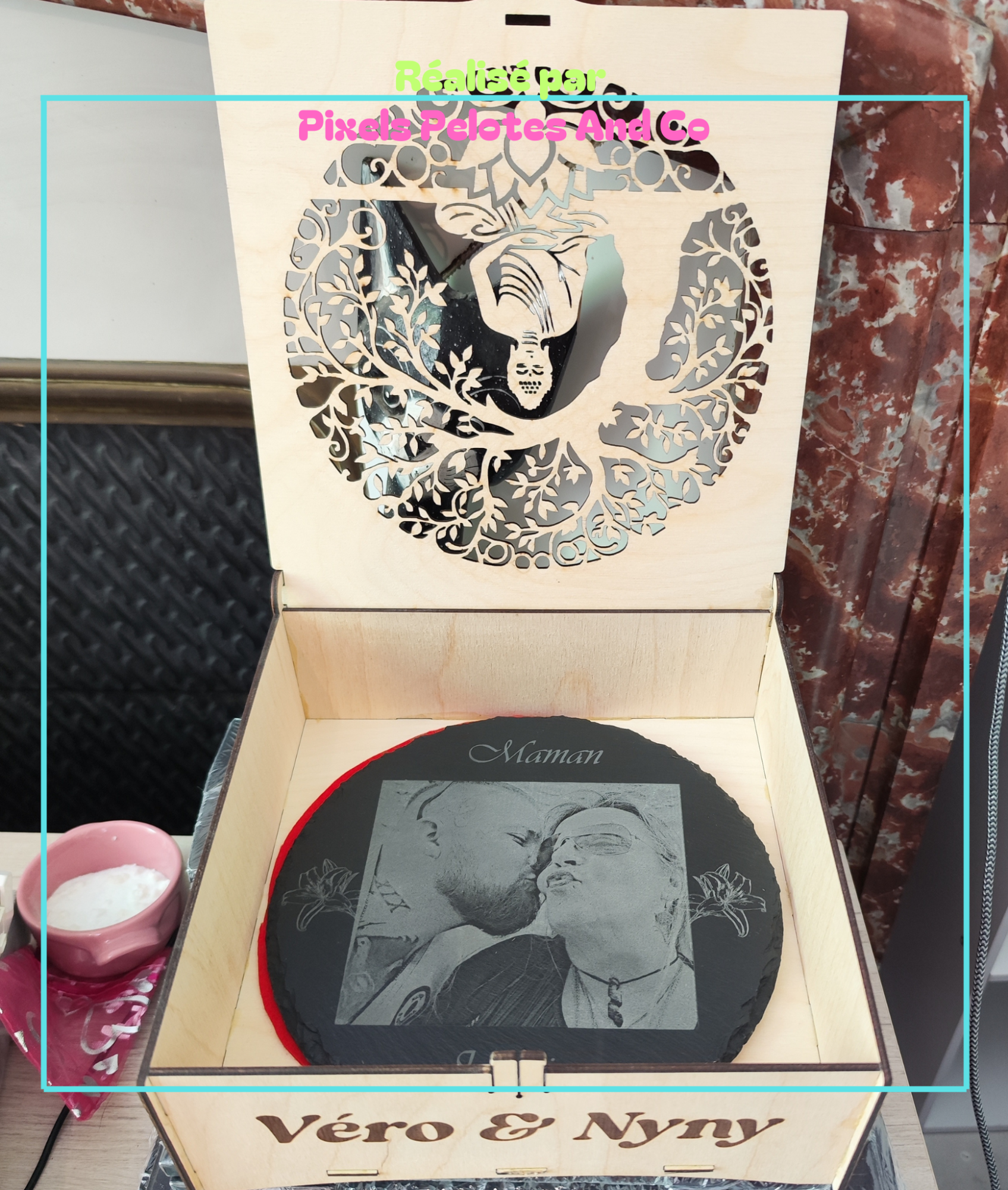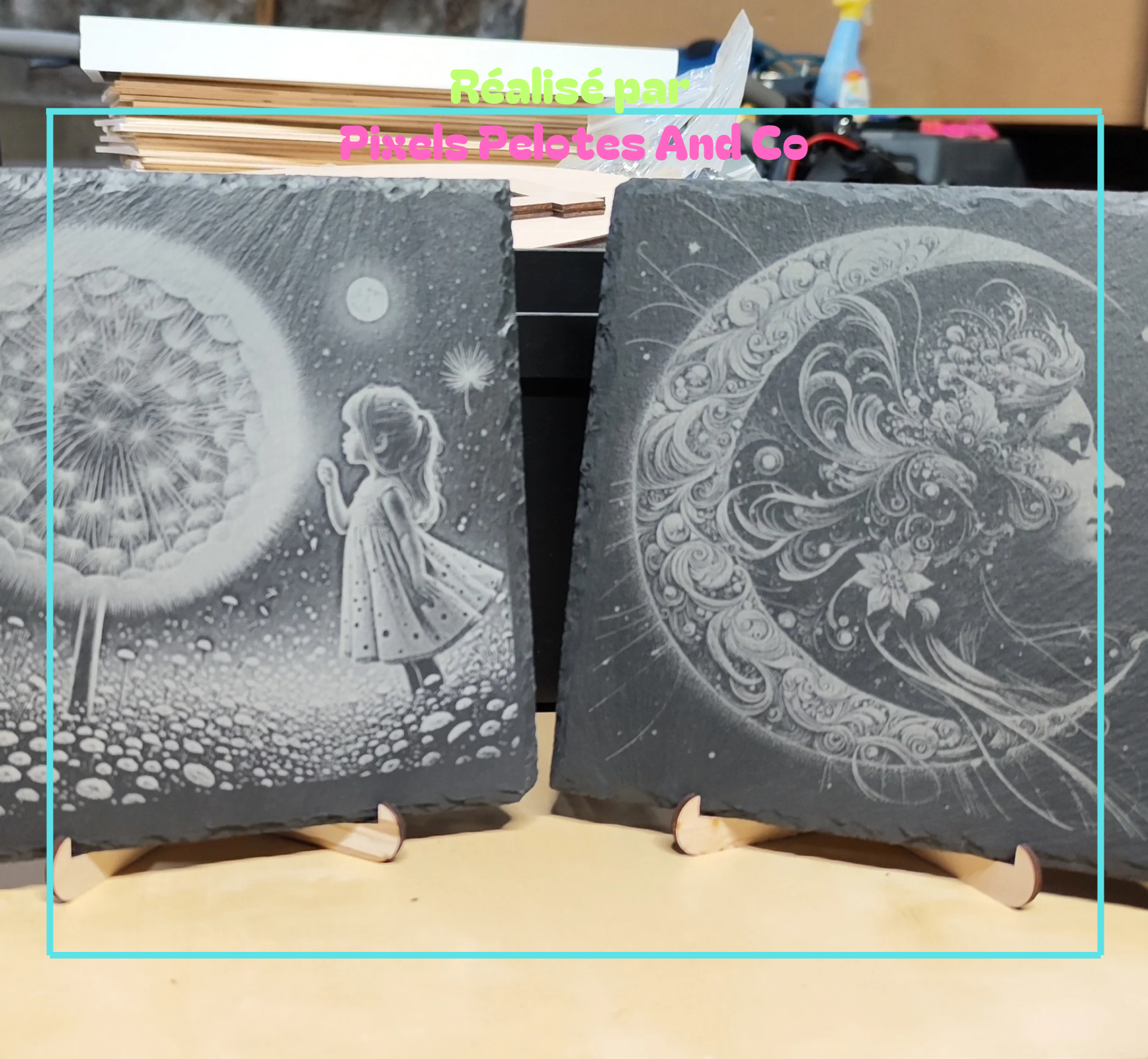 Gravure d'images comme décorations murales ou à poser, horloge ou autel.